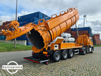 En laten we niet vergeten dat de trekker, een MAN TGS, die voor deze oplegger staat, een jaar geleden ook door ons werd opgeleverd. We hebben ervoor gezorgd dat deze naadloos kon worden gekoppeld aan zijn nieuwe oplegger. De trekker is uitgerust met een CVS vacuümpomp met een indrukwekkend debiet van 3100m². Daarnaast hebben we ook nog een Pratissoli KT28 hogedrukpomp gemonteerd, met een debiet van 70 liter bij een werkdruk van 200 bar.
